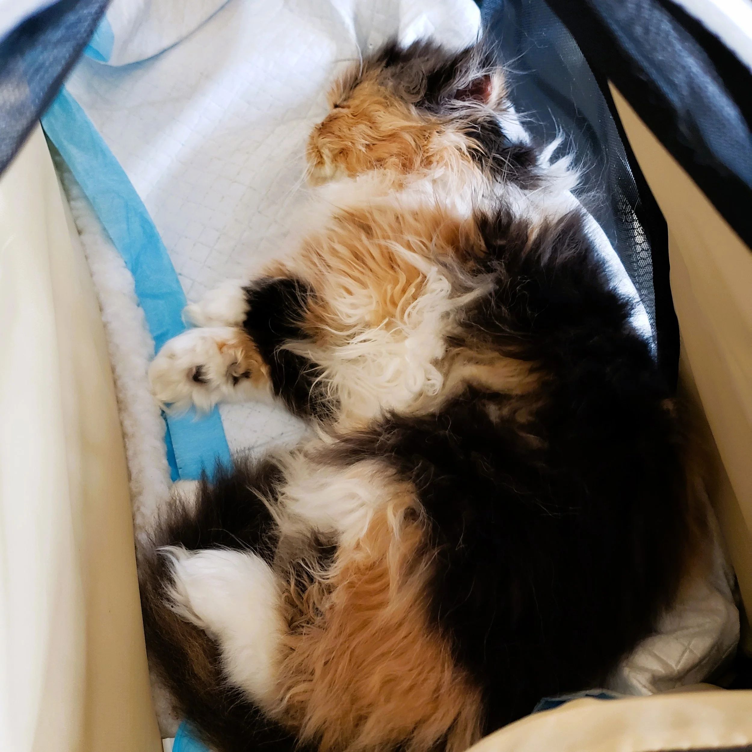 Bella, the Exotic Longhair, sleeping soundly in her travel carrier.